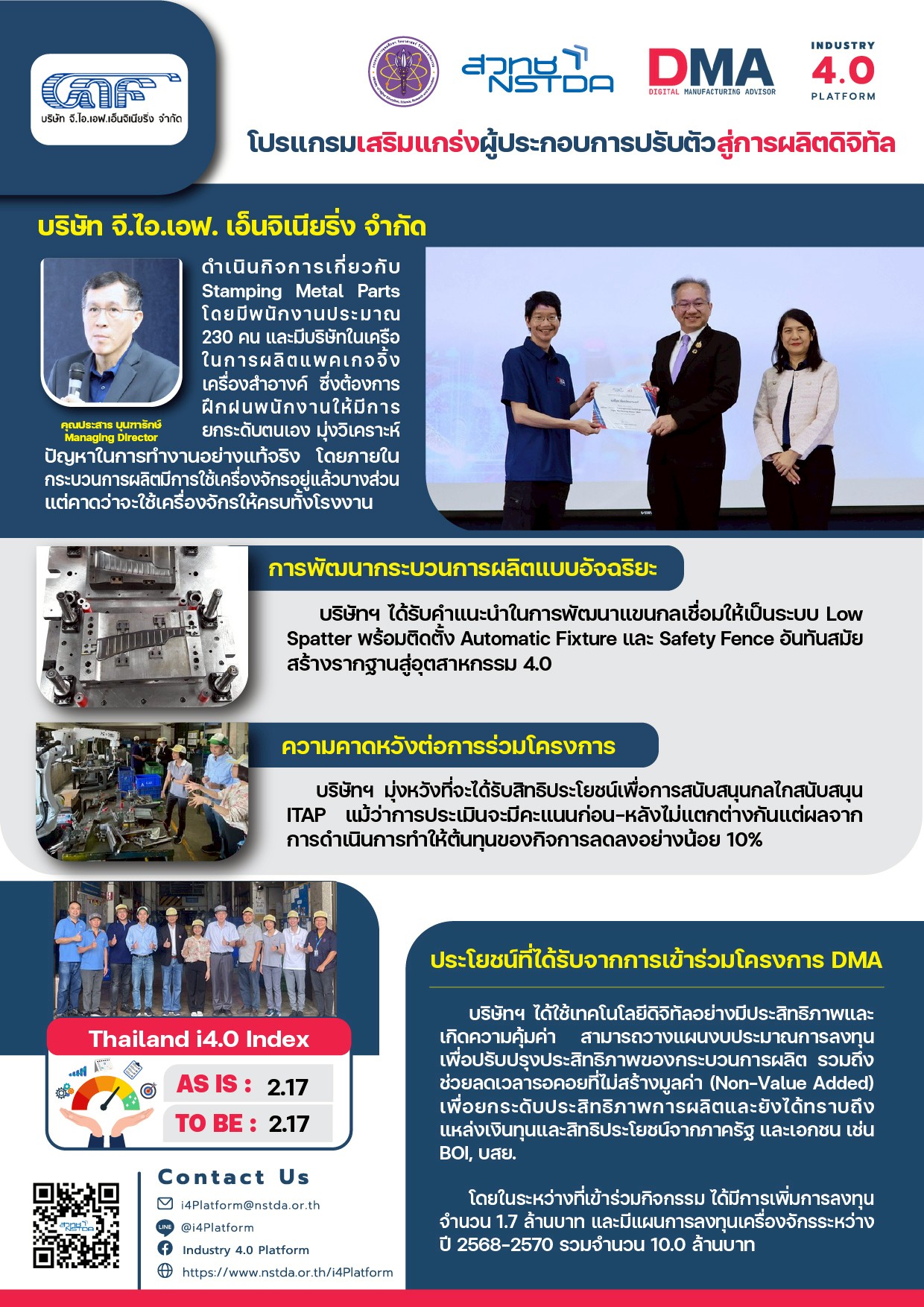 ดำเนินกิจการเกี่ยวกับ Stamping Metal Parts โดยมีพนักงานประมาณ 230 คน และมีบริษัทในเครือ ในการผลิตแพคเกจจิ้ง เครื่องสำอางค์ ซึ่งต้องการ ฝึกฝนพนักงานให้มีการ ยกระดับตนเอง มุ่งวิเคราะห์ ปัญหาในการทำงานอย่างแท้จริง โดยภายใน กระบวนการผลิตมีการใช้เครื่องจักรอยู่แล้วบางส่วน แต่คาดว่าจะใช้เครื่องจักรให้ครบทั้งโรงงาน - การพัฒนากระบวนการผลิตแบบอัจฉริยะ