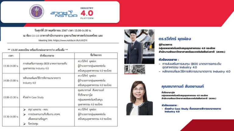 สำนักงานพัฒนาวิทยาศาสตร์และเทคโนโลยีแห่งชาติ โดยกลุ่มแพลตฟอร์มสนับสนุนอุตสาหกรรม 4.0 ของไทย ได้จัดการประชุมเชิงปฏิบัติการ (Workshop) เพื่อสื่อสารและทำความเข้าใจหลักเกณฑ์และวิธีการพิจารณาแบบคำขอรับการส่งเสริมการลงทุน (BOI) มาตรการยกระดับอุตสาหกรรม Industry…