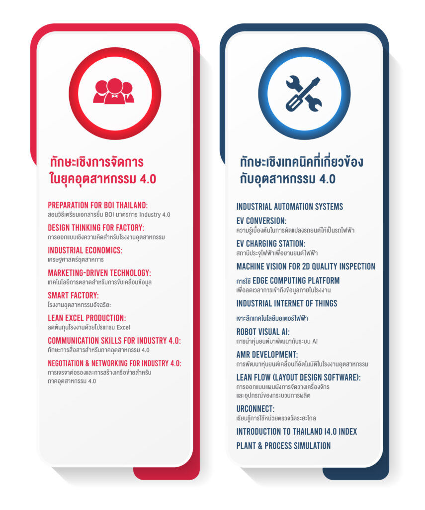 ยกระดับความสามารถ เตรียมความพร้อม และพัฒนาทักษะที่จำเป็นต่อการใช้ประโยชน์จากความก้าวหน้าทางเทคโนโลยี ตอบโจทย์ความท้าทายของยุคสมัย ที่ขับเคลื่อนไปด้วยเทคโนโลยีสู่การเป็นอุตสาหกรรม 4.0 จำเป็นต้องอาศัยการพัฒนาทักษะความรู้ ความสามารถเฉพาะด้านและการบริหารจัดการ Industry 4.0 Platform จึงร่วมกับ ศูนย์นวัตกรรมการผลิตยั่งยืน (SMC) จัดหลักสูตรในการพัฒนาทักษะความสามารถของผู้ที่ต้องการเพิ่มความรู้เพื่อนำไปสร้างมูลค่า ต่อยอด และพัฒนา ให้ก้าวทันต่อยุคสมัย โดยปัจจุบันมีหลักสูตรฝึกอบรมดังนี้