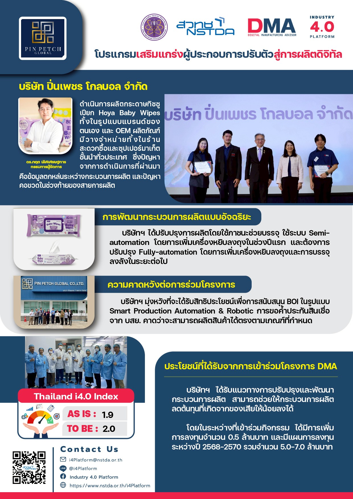 ดำเนินการผลิตกระดาษทิชชูเปียก Hoya Baby Wipes ทั้งในรูปแบบแบรนด์ของตนเอง และ OEM ผลิตภัณฑ์มีวางจำหน่ายทั้งในร้านสะดวกซื้อและซุปเปอร์มาเก็ตชั้นนำทั่วประเทศ ซึ่งปัญหาจากการดำเนินการที่ผ่านมา คือข้อมูลตกหล่นระหว่างกระบวนการผลิต และปัญหาคอขวดในช่วงท้ายของสายการผลิต - การพัฒนากระบวนการผลิตแบบอัจฉริยะ
